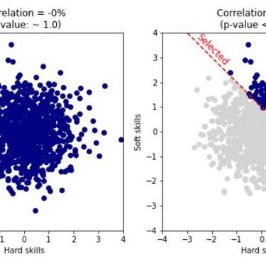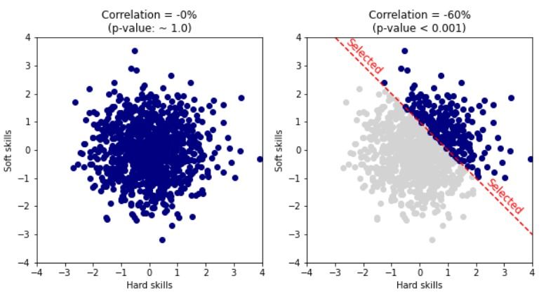 👉 The people we work with are not random people. They have passed a hiring process that tested them on multiple hard and soft skills and selected only people with a high total value of these skills. ⚠ This selection may result in skills being negatively correlated even if they are independent in the population of all job applicants.